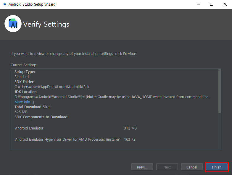 - 검토 후 "Finish"를 눌러서 기타설정사항들을 설치!!