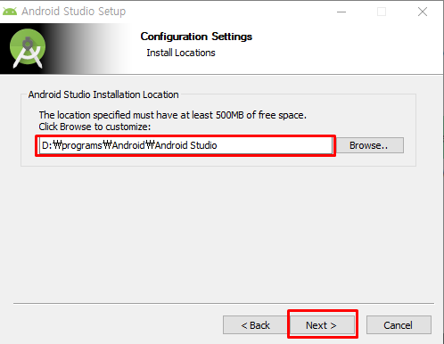 8. 안드로이드 스튜디오의 설치경로 선택 → Next 클릭