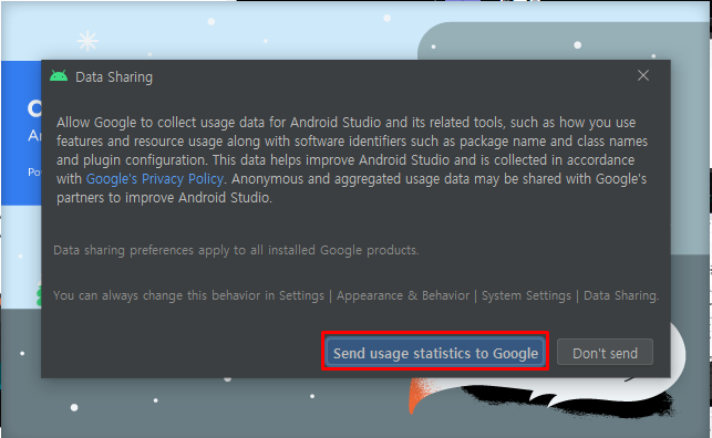 → 구글에 전송해도 상관없다면 "Send usage statistics to Google" 클릭
