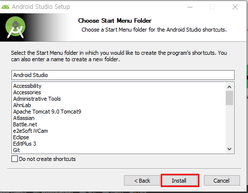 - 시작 메뉴의 폴더 이름을 Android Studio가 아닌 다른 것으로 바꾸고 싶은 경우 변경 가능