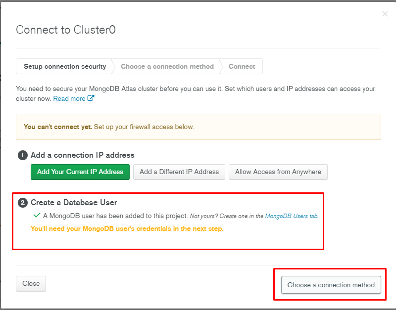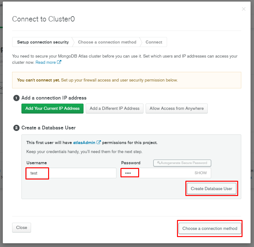 8. Create Database User 완료 → Choose a connection method 클릭!