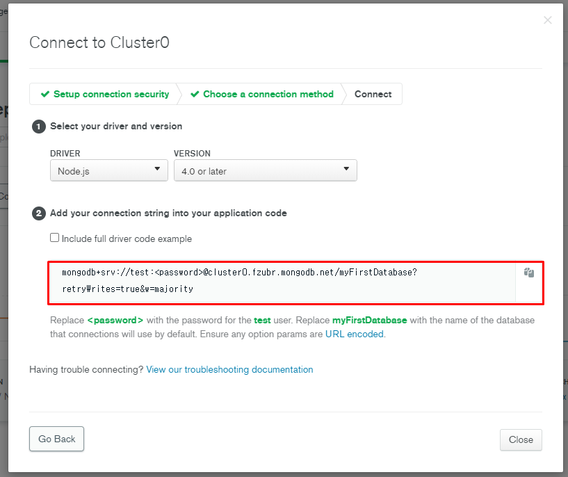 그리고 test:<password>는 7번 에서 입력했던 db정보를 (test:1234 이렇게 '<>'는 없애고 ) 기입하시면 됩니다.