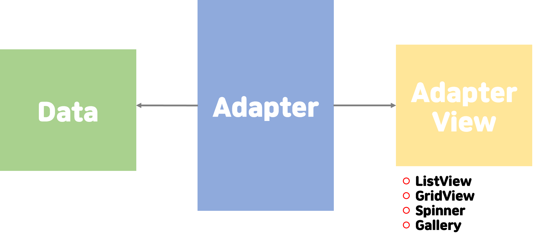 많은 정보를 효율적으로 처리하기 위해서 View에 바로 데이터를 제공하지 않고 어댑터 객체를 이용한다.